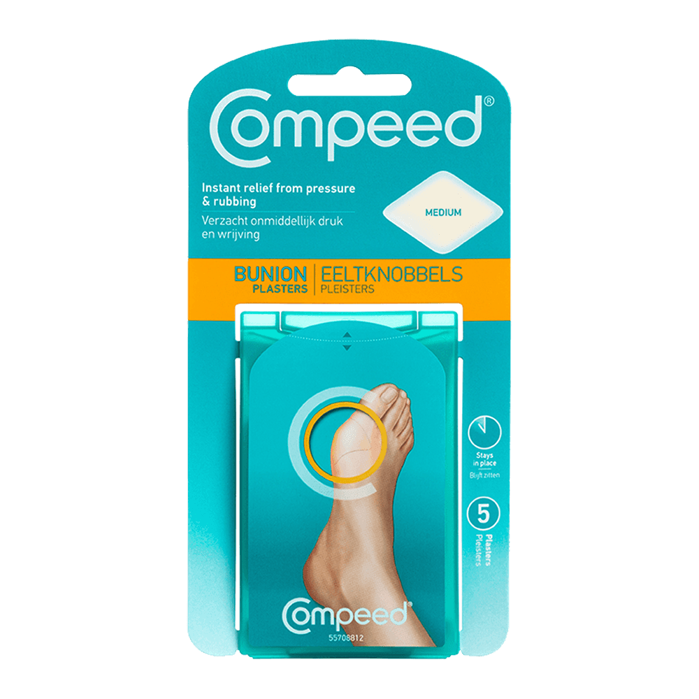 Compeed® Hallux Valgus-plåster är speciellt utformade för att passa runt foten och ger lindring från smärtsamt tryck och friktion. De hjälper till att förhindra blåsor och ytterligare förhårdnader på huden som kan leda till andra smärtsamma hudåkommor.
